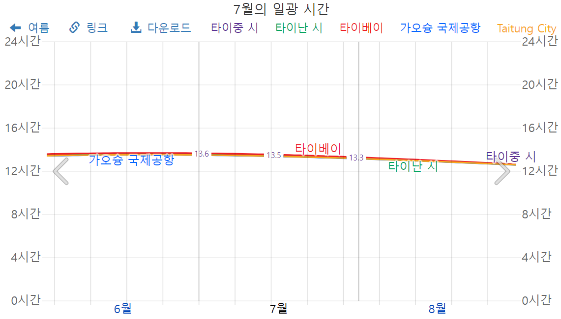 7월 대만에서 해 떠있는 시간은, 대부분의 지역이 13~13시간 30분 정도로써, 해가 빨리 지지 않는 적당한 편이라고 보시면 됩니다.