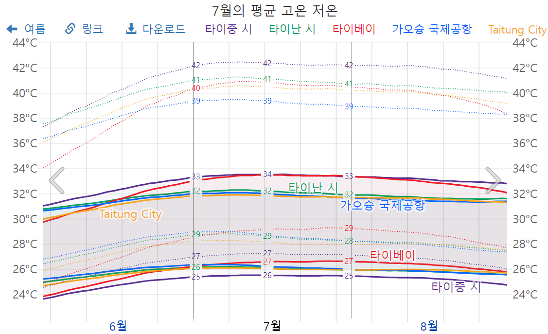 [2] 타이중과 타이난, 타이베이, 가오슝, 타이둥의 7월 날씨를 확인하시기 바랍니다.