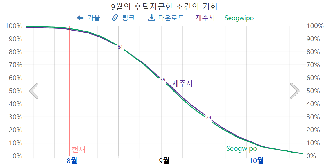 9월 한라산의 강수 확률은, 9월 초에 가장 높고, 9월 말에 가장 낮은데요, 9월 초, 최고 41%, 9월 말 최저 23%로 예상됩니다.