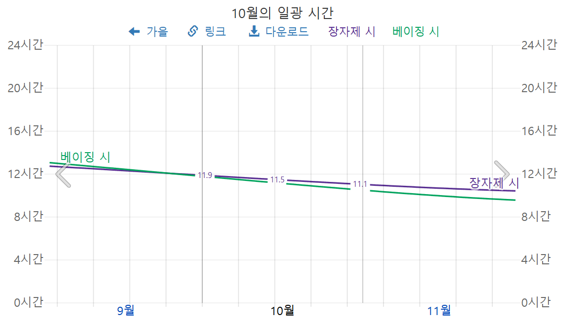 10월 장가계의 일광 시간은, 10월 초 12시간, 10월 중순 11시간 30분, 10월 말 11시간으로써, 월말로 갈수록 해가 빨리 지겠습니다.