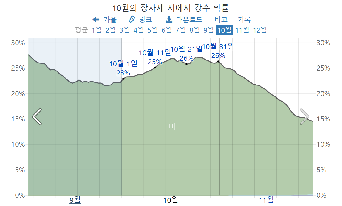 10월 장가계의 강수 확률은, 10월 초 23%, 10월 말 26%로써, 전반적으로 비가 적게 내려 여행하기 매우 좋은 시기라고 보입니다.