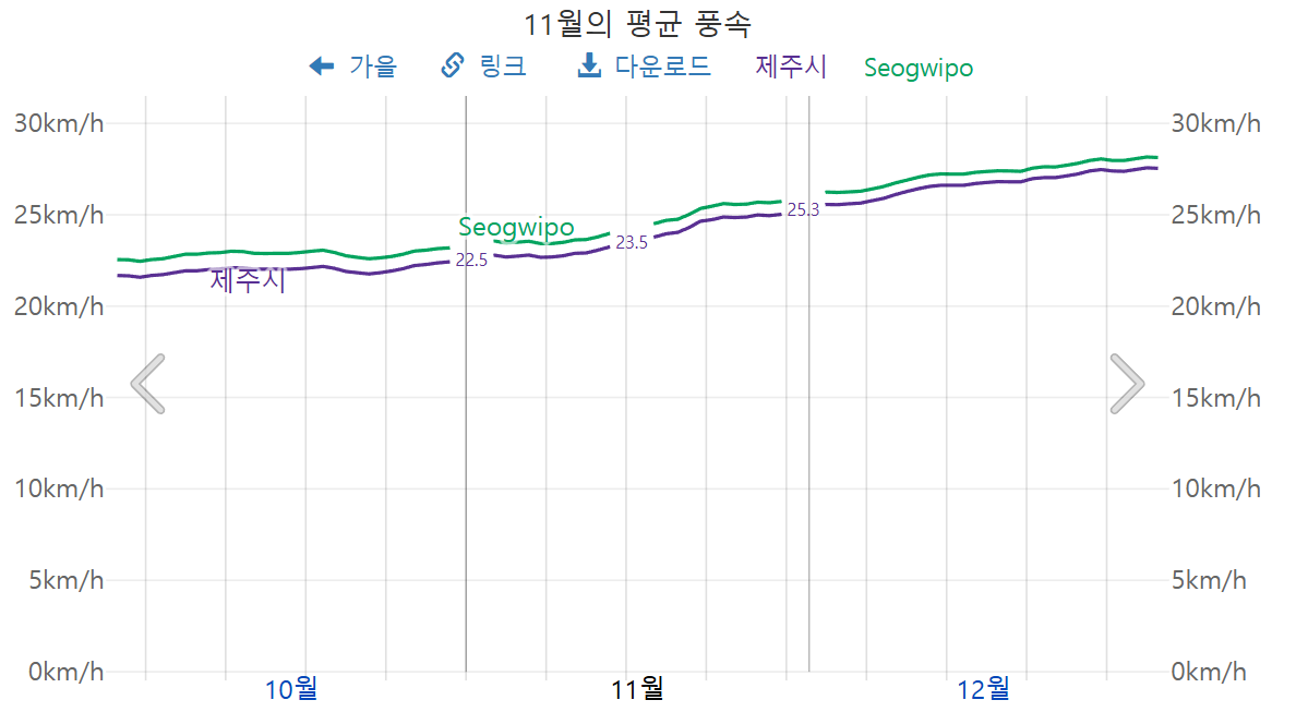 11월 제주도의 풍속은, 20km/h 이상으로써, 상당히 바람이 많이 불어 대비하는 편이 좋습니다.