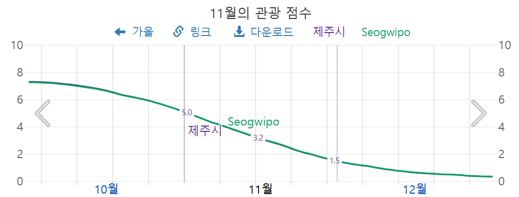 11월 제주도의 관광 점수는, 11월 초 5점, 11월 말 1.5점으로써, 월초에 여행하는 편이 낫습니다.
