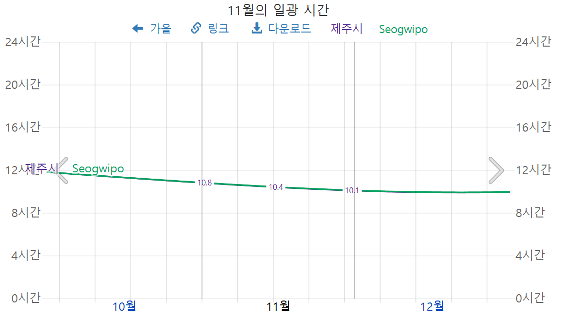 11월 제주도의 일광 시간은, 11월 초 10.8시간, 11월 말 10시간으로써, 해가 상당히 빨리 지겠습니다.
