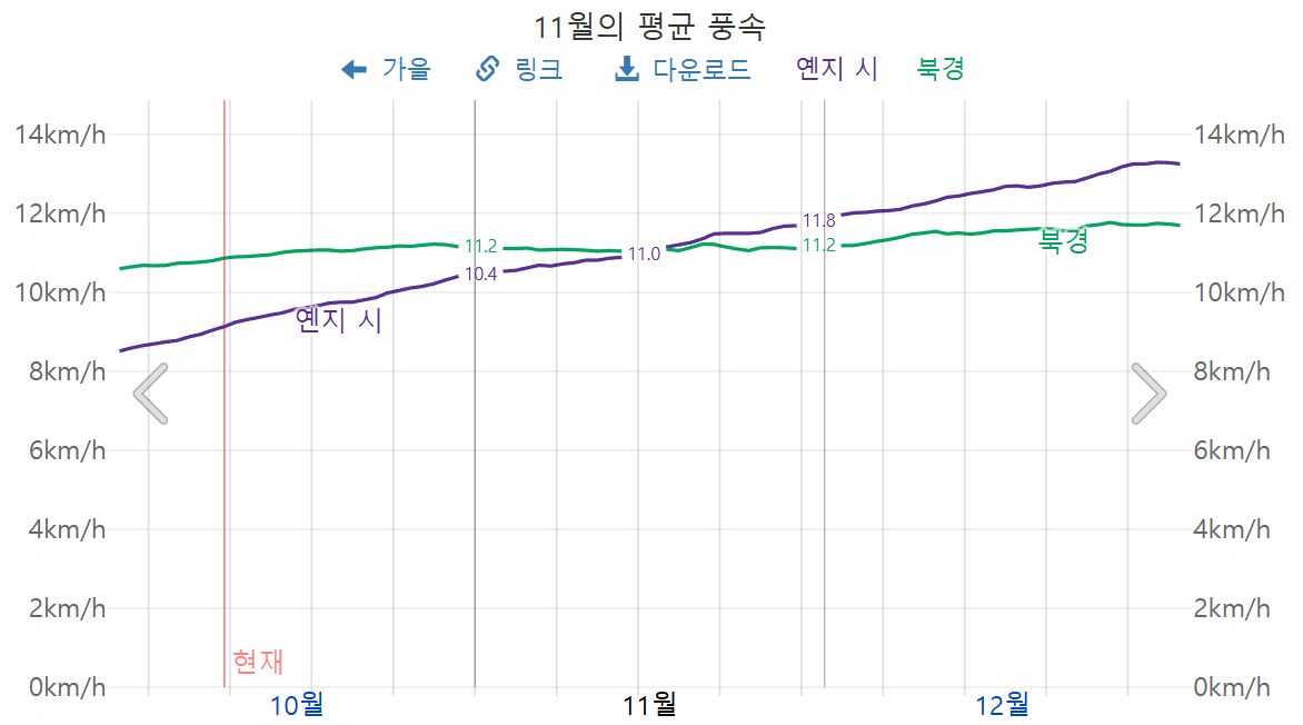 11월 백두산의 풍속은, 10~12km/h로써, 바람이 꽤 부는 편입니다.