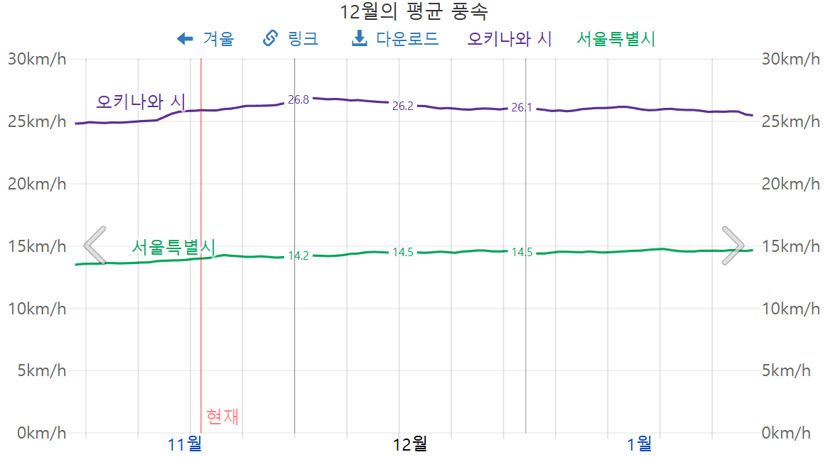 12월 오키나와의 바람 세기는, 26km/h 이상으로써, 바람이 상당히 강하게 불겠습니다.