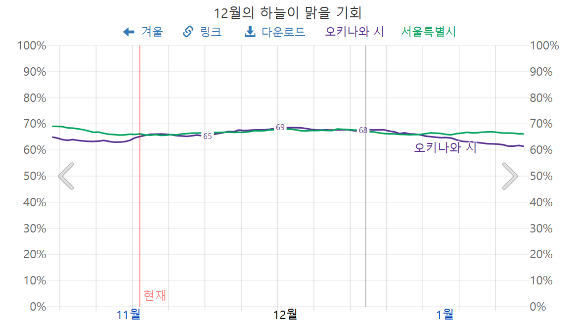 12월 오키나와의 맑을 확률은, 70% 이하로써, 상당히 맑다는 것을 알 수 있습니다.