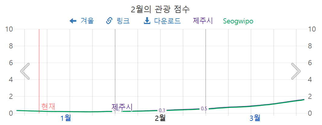 2월 제주도의 관광 점수는, 0점대로써, 그리 여행하기는 좋지 않지만, 다른 지역에 비해서는 따뜻합니다.