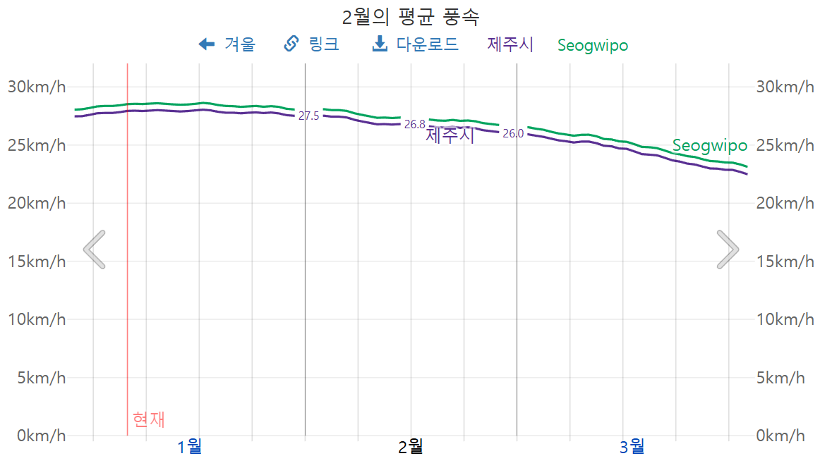2월 제주도의 풍속은, 26~28km/h로써, 상당히 바람이 많이 불기 때문에, 옷차림에 신경 쓰시기 바랍니다.