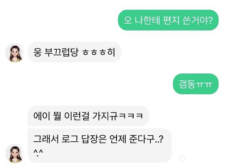 ✓ 그러면 위와 같이, 머선 공부를 하고 있는 거냐고라는 답변을 받을 수 있으며, 편지 답장에 대한 내용은 나오지 않았습니다.